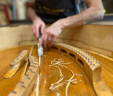 -restauration et remise en place des cordes: bouclettes Françaises et Allemandes, nettoyage, remplacement cordes filées, remontage des cordes acier suivant l'époque, remise en tension...